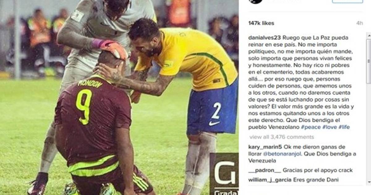 “Ruego que La Paz pueda reinar en ese país. No me importa politiqueo, no me importa quién mande, solo importa que personas vivan felices y honestamente. No hay rico ni pobres en el cementerio, todas acabaremos allá.... por eso ruego que, personas cuiden de personas, que amemos unos a los otros, cuando no daremos cuenta de que se está luchando por cosas sin valores? El valor más grande es la vida y nos estamos quitando unos a los otros este derecho. Que Dios bendiga el pueblo Venezolano”. Este es el texto que acompaña a la foto en la que sale el propio futbolista con el delantero venezolano Salomón Rondón.