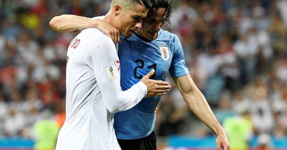 Uruguay's forward Edinson Cavani (R) celebrates his team's victory during the Russia 2018 World Cup round of 16 football match between Uruguay and Portugal at the Fisht Stadium in Sochi on June 30, 2018.Uruguay sent Cristiano Ronaldo and Portugal crashing out of the World Cup on Saturday as a pair of stunning goals from Edinson Cavani gave the South Americans a 2-1 victory. / AFP PHOTO / Odd ANDERSEN / RESTRICTED TO EDITORIAL USE - NO MOBILE PUSH ALERTS/DOWNLOADS