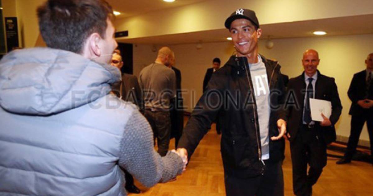 En la imagen Cristiano se ve estrechando la mano con una sonrisa al crack argentino que amablemente responde al saludo hecho por goleador del Real Madrid.