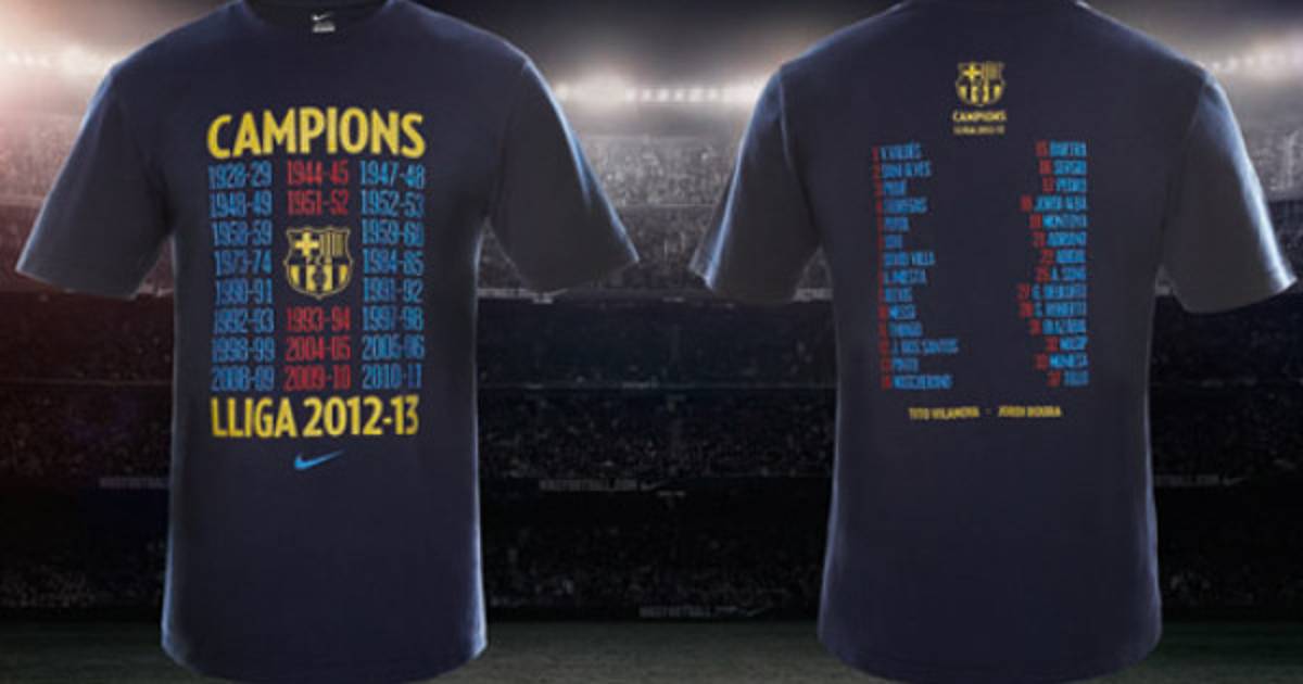 Detrás, por orden de dorsales, aparecen los nombres de todos los jugadores que han contribuido en ello, así como el de los dos entrenadores, Tito Vilanova y su segundo, Jordi Roura. La camiseta la podrán adquirir los aficionados en las tiendas del club.