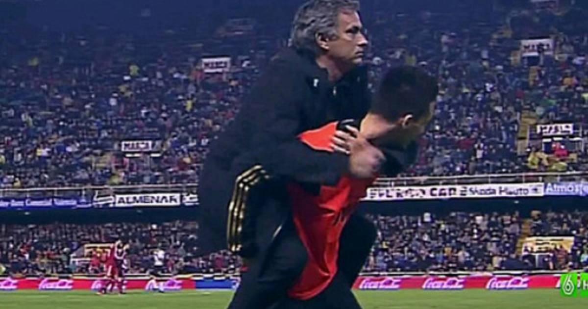 La imagen llamativa después del triunfo 3-2 del Real Madrid ante el Valencia: El técnico, José Mourinho celebró el tercer gol de su equipo, logrado por Cristiano, subiéndose a caballito encima de Callejón.