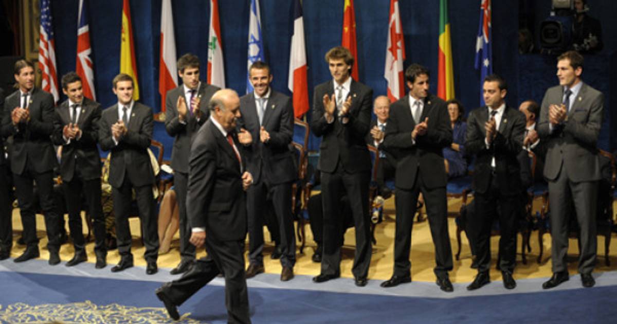 Vicente del Bosque fue el encargado de recibir el premio de manos de Don Felipe, pero el actual seleccionador rompió el protocolo para invitar a que se unieran a él y a los jugadores que representaban a la selección tanto su antecesor, Luis Aragonés, como el presidente de la Federación Española, Ángel Villar.