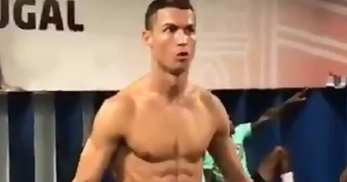 La escenase puede observar a los futbolistas y al cuerpo técnico 'quietos' entorno a la figura de Cristiano Ronaldo que aparece inmovil y en calzoncillos en mitad de la estancia como un auténtico maniquí de tienda, luciendo abdominales y ropa interior de su marca personal.