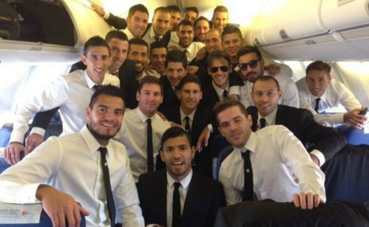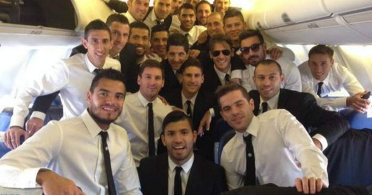 Los jugadores de la Selección de Argentina lucen tranquilos durante el viaje que los lleva a Brasil. Es una comitiva de unas 300 personas