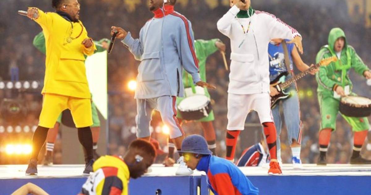 La ceremonia previa a la final contó con la participación de 450 personas: 150 bailarines profesionales, 120 militares, encargados de desplegar la alfombra gigante sobre el césped, 172 del personal de producción, cinco músicos y los tres cantantes de Black Eyed Peas.