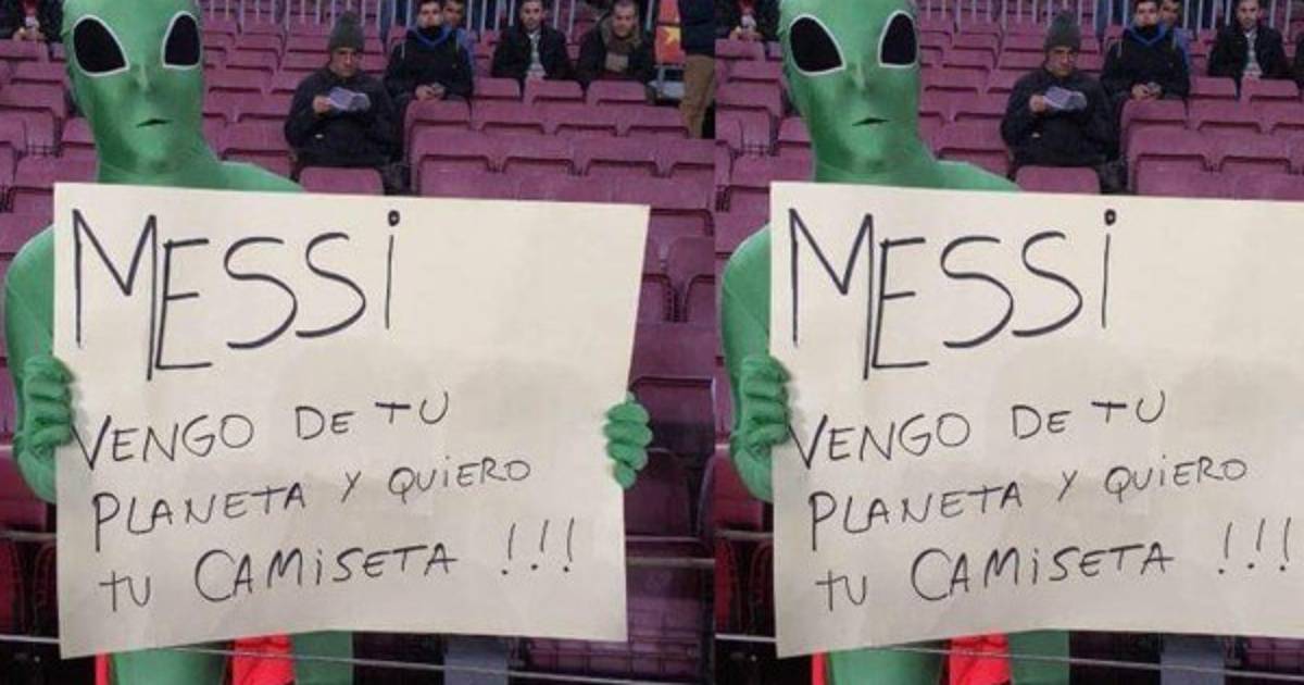 Este miércoles en el estadio Camp Nou de Barcelona un hincha fue vestido como extraterrestre con una pancarta dirigida a Lionel Messi.