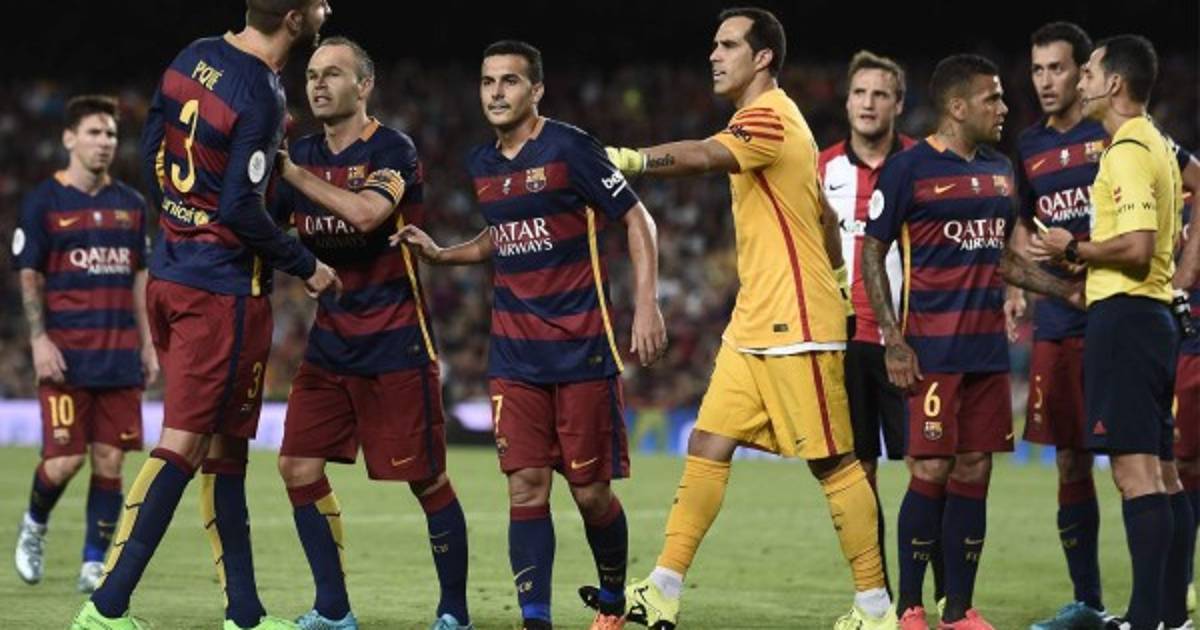 Piqué arremetió contra el línea Velasco Carballo quien reclamaba un fuera de juego en una jugada de peligro de Aduriz que terminó tapando Claudio Bravo.