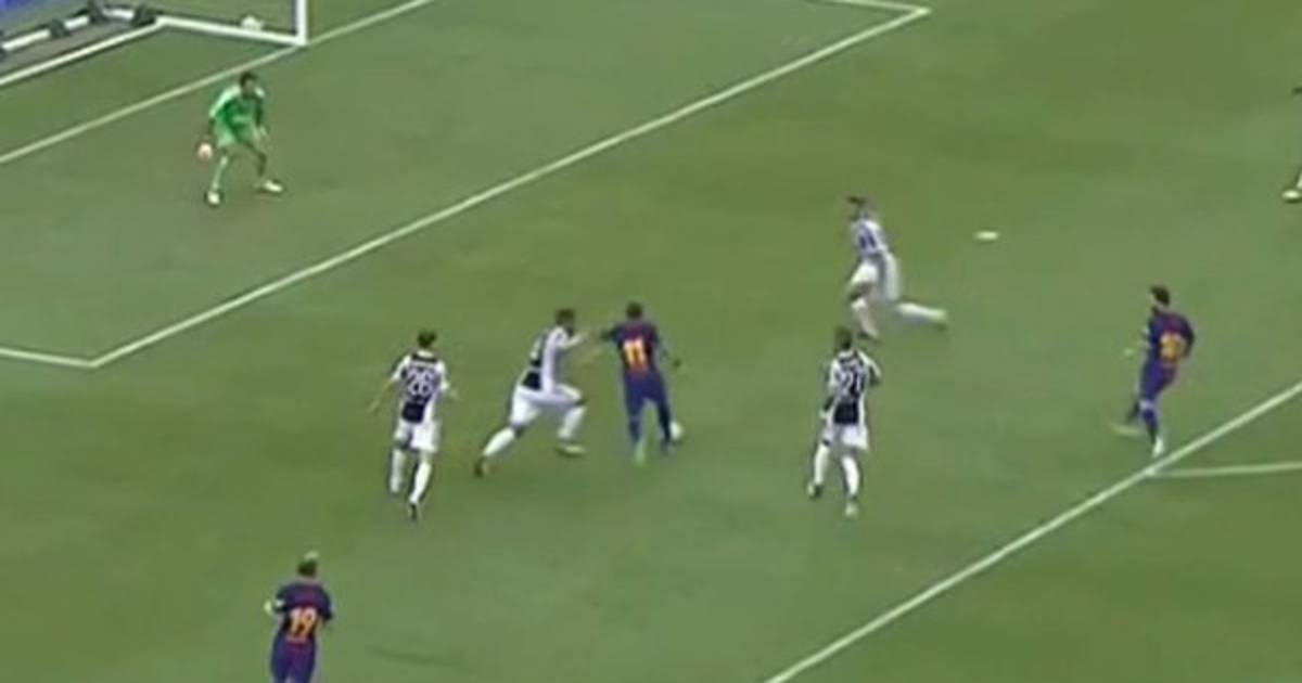 Ney tomó el balón al borde del área, superó la primera marca, luego vienieron cuatro más y con un solo amague los eludió sin problemas, luego disparó y marcó.