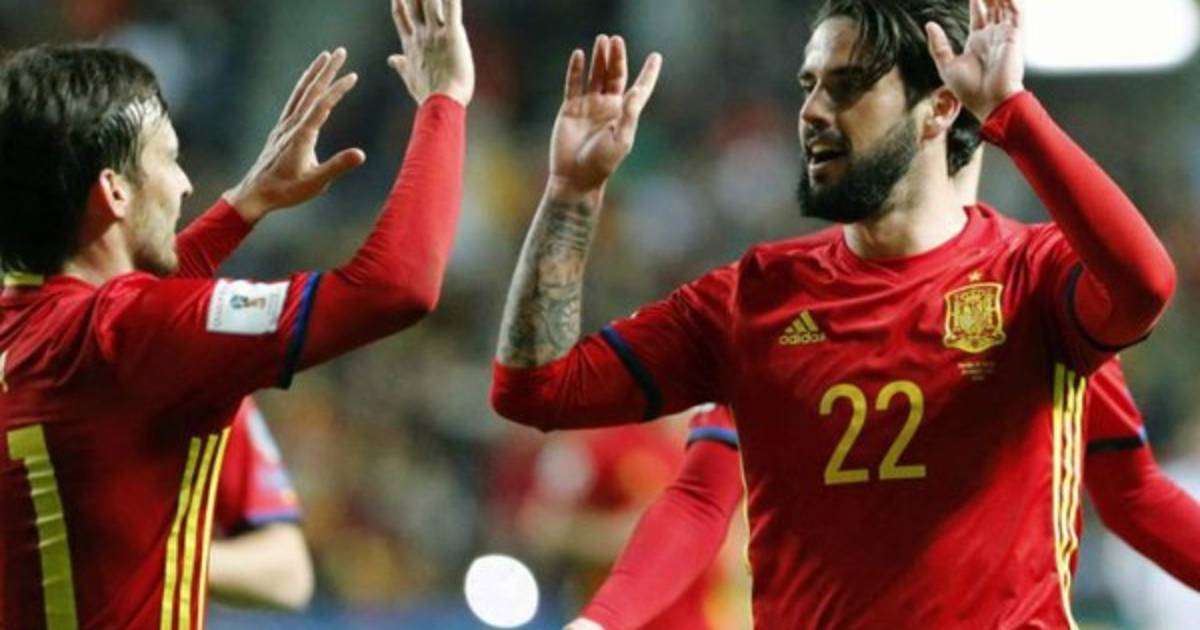 4 - España: De Gea; Carvajal, Sergio Ramos, Piqué, Jordi Alba; Busquets, Thiago (Koke, m.63), Iniesta (Isco, m.70); Vitolo (Iago Aspas, m.83), Silva y Diego Costa.