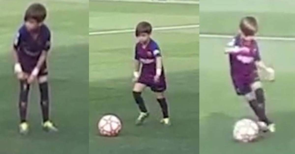 El retoño del jugador catalán mostró pequeños signos practicando sus lanzamientos de tiro libre frente a la portería.