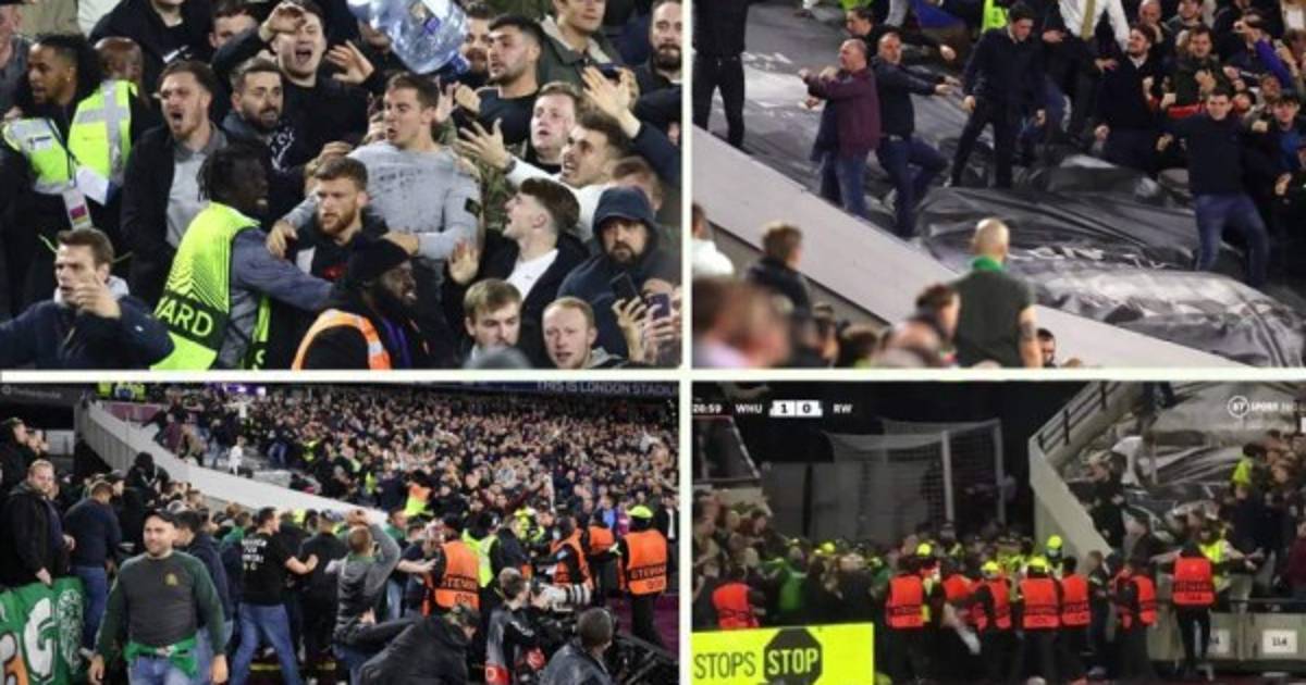 Durante el encuentro entre West Ham United y Rapid Viena de Austria los hinchas empezaron a pelearse tras que el equipo inglés anotara el gol que les ponía en ventaja en Londres; la diana la anotó Declan Rice y los 'hammers' se fueron marchando al descanso.