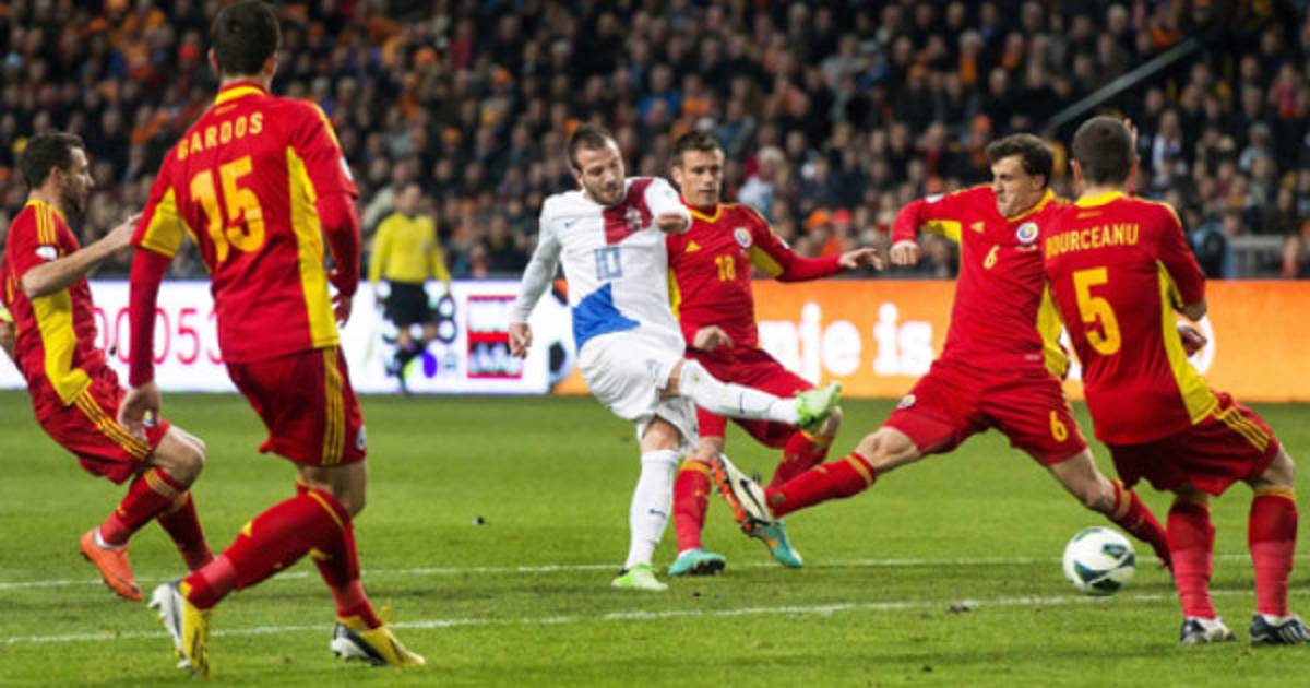 Sin su capitán y organizador Wesley Sneijder (lesionado el viernes en la victoria ante Estonia), los holandeses dominaron el partido desde el comienzo.