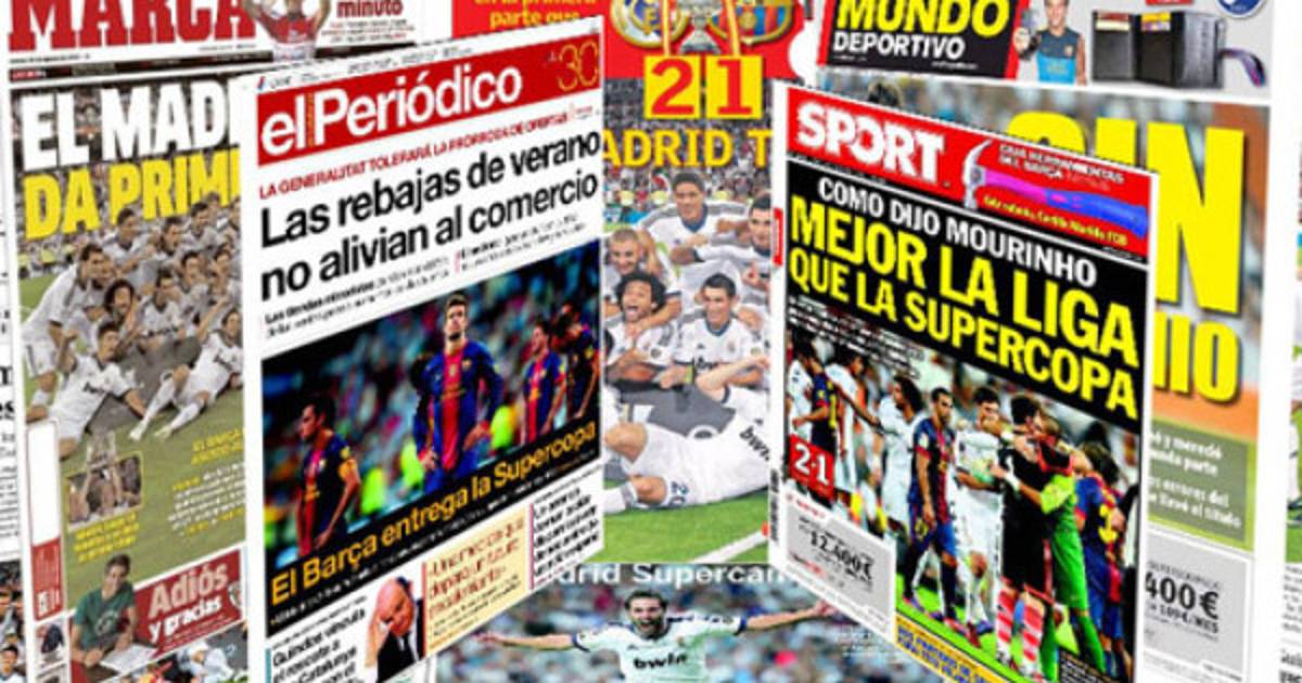 El diario Sport, por su parte, muestra en su portada a los jugadores de ambos equipos saludándose al término del encuentro y titula: 'Como dijo Mourinho, mejor la Liga que la Supercopa'.