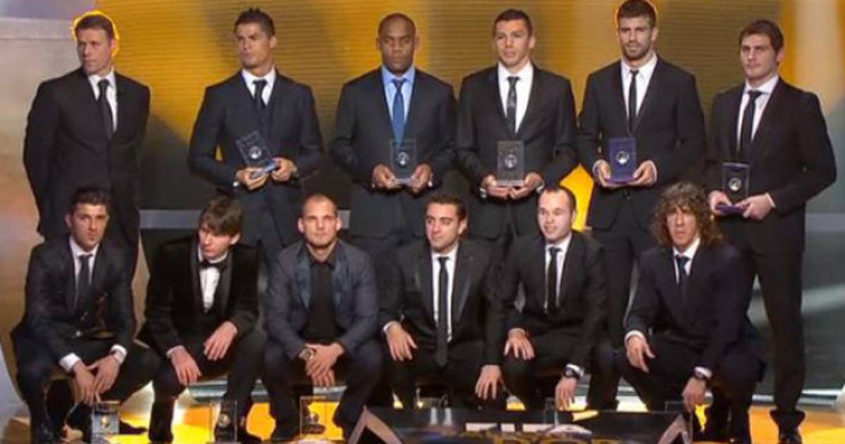 Son seis los jugadores del Barcelona : Piqué, Puyol, Xavi, Iniesta, Villa y Messi, por tres del Inter: Maicon, Lucio y Sneijder), mientras que el Real Madrid completa el once con Iker Casillas y Cristiano Ronaldo.