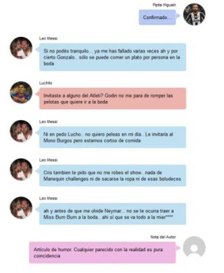 Sin embargo, en las redes sociales ya han hecho humor sobre la boda de Messi y realizaron una parodia de un grupo de WhatsApp donde aparece en la conversación Messi invitándolos a todos, incluso Cristiano.