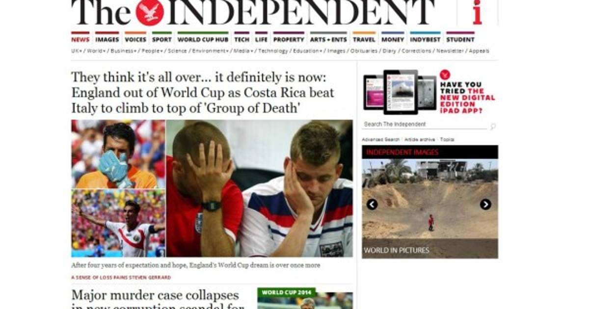 ' Inglaterra queda fuera del Mundial ya que Costa Rica venció a Italia para subir a la parte superior de grupo de la muerte', tituló The Independent al hacer énfasis en las derrotas inglesas ante Italia y Uruguay, que redujeron las posibilidades al mínimo.