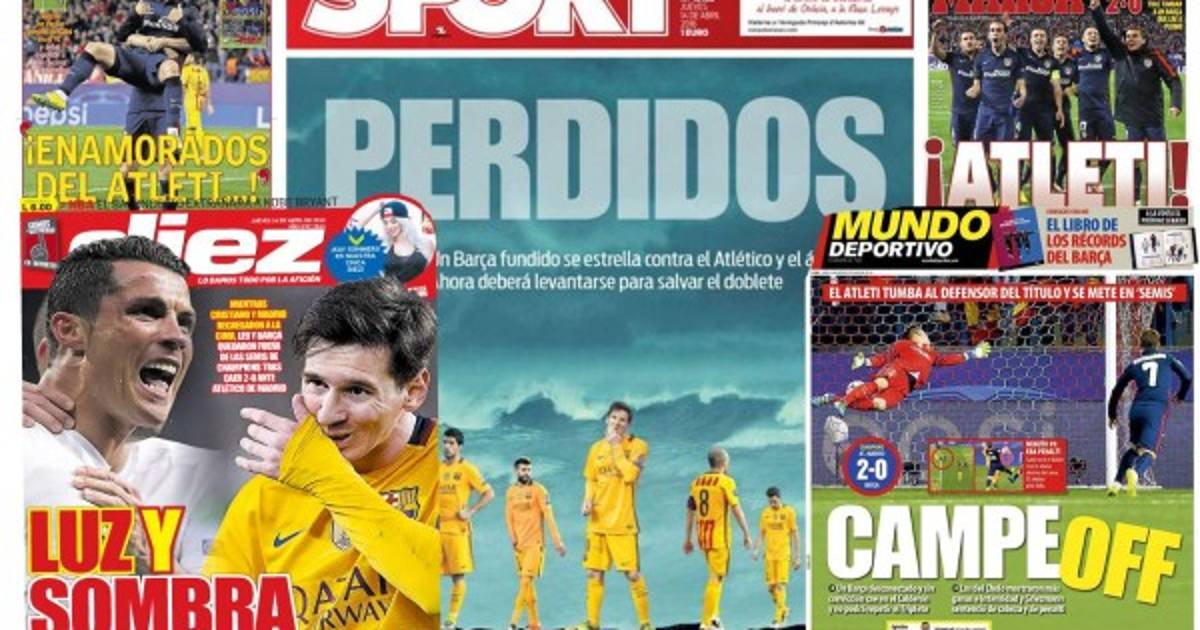 Por su parte, 'Sport' considera la derrota del Barcelona como un 'golpe psicológico' que pone 'fin al sueño europeo' y sitúa en portada una foto-montaje del mar con los pupilos de Luis Enrique, a los que les acompaña la palabra 'Perdidos'.