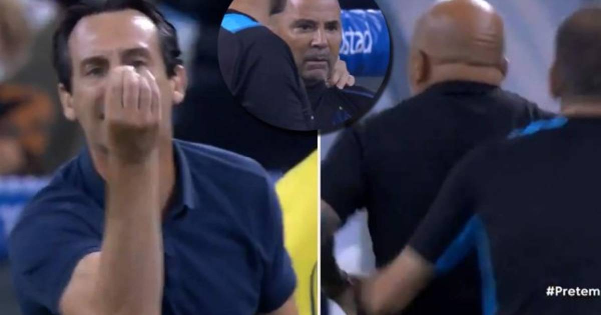Unai Emery, técnico del 'Submarino Amarillo', fue expulsado con roja directa por protestar y, lejos de calmarse, se enzarzó en una tremenda discusión a gritos con Jorge Sampaoli, su homólogo en el conjunto francés.
