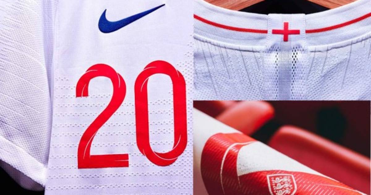 Inglaterra vestirá de blanco en su primer uniforme y el cuello será redondo, aunque el corte redondo es bastante largo. Además, tendrá el detalle que la camiseta llevará en la parte de atrás la bandera de Inglaterra, algo que viene siendo repetido en muchas camisetas de selecciones.