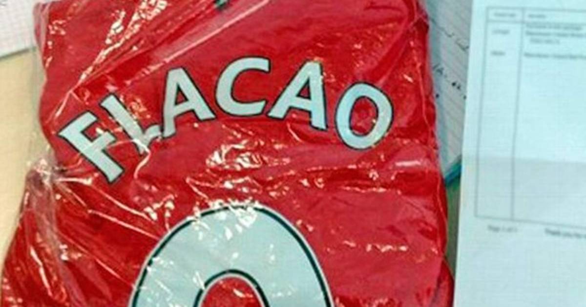 La fotografía que publicó 'ESPN UK', se puede observar la primera equipación del Manchester United con el número del delantero colombiano y el nombre ' Flacao', junto a la nota del envío por parte de la tienda.
