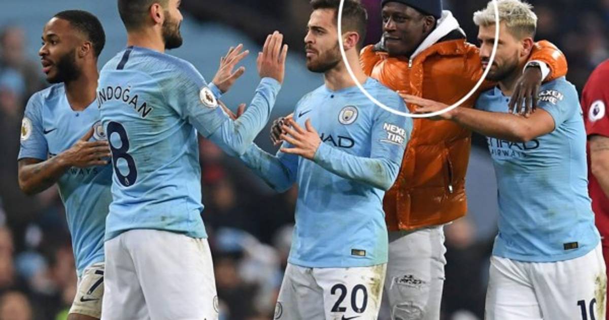 Al momento que la seguridad se entera que se trata de Benjamin Mendy, ellos, de forma persuasiva, se dirigieron hasta el centro del campo, causando las risas de la afición y algunos jugadores del City.