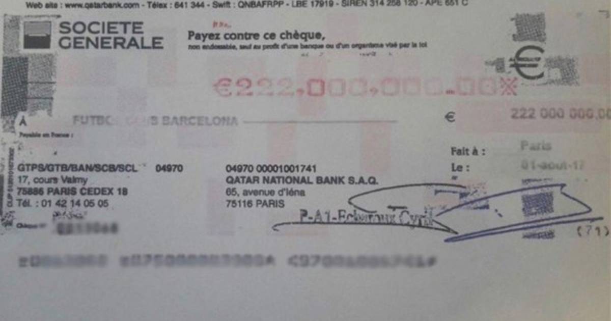 PSG, mediante redes sociales comenzó a circular el supuesto cheque que liberó al brasileño del Barcelona.