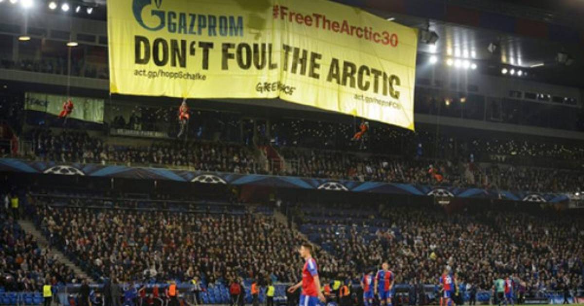En el minuto 4 de partido, el estadio St. Jakob-Park contempló la actuación de activistas de Greenpeace, que descolgaron desde la grada una enorme pancarta reivindicativa en contra de Gaszprom, la empresa energética rusa que es uno de los patrocinadores de la Liga de Campeones y del conjunto alemán. El partido estuvo interrumpido durante varios minutos.