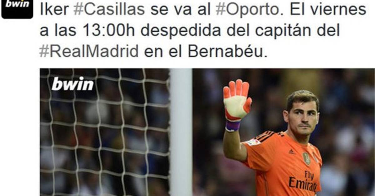 'Iker Casillas se va al Oporto. El viernes a las 13:00 horas será la despedida del capitán del Real Madrid en el Bernabéu', escribieron.