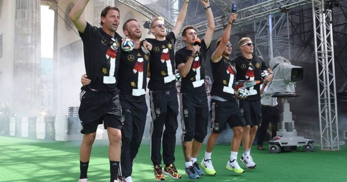 La escena se produjo cuando Mario Götze, autor del único gol en la final del domingo ante Argentina, Miroslav Klose, Toni Kroos y otros tres jugadores fueron presentados al público ante los miles de hinchas que esperaban ante el escenario colocado junto a la emblemática Puerta de Brandeburgo en Berlín.