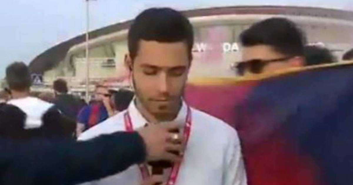 El comunicador se preparaba para hacer un enlace en directo en las afueras del Wanda Metropolitano, pero los fanáticos paseaban frente a él haciédole muecas e incomodándolo, hasta que finalmente lo dejaron tranquilo para realizar su trabajo.