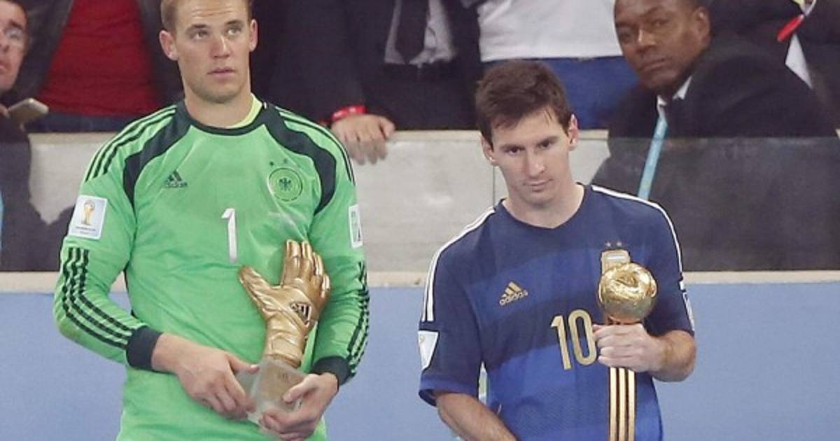 Apesadumbrado por la derrota, el futbolista argentino recorrió los cien metros hasta el palco, donde recibió del presidente de la FIFA, el suizo Joseph Blatter, un balón dorado que le acredita como el futbolista más valioso de Brasil.