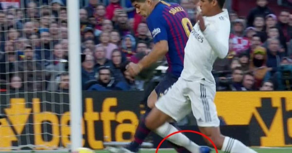 Raphael Varane, defensa del Real Madrid, derribó dentro del área con un puntillazo sobre la pantorrilla de Suárez quien se fue al piso. El colegiado Sánchez Martínez no sancionó la acción durante el juego, pero de inmediato los jugadores del Barcelona reclamaron.