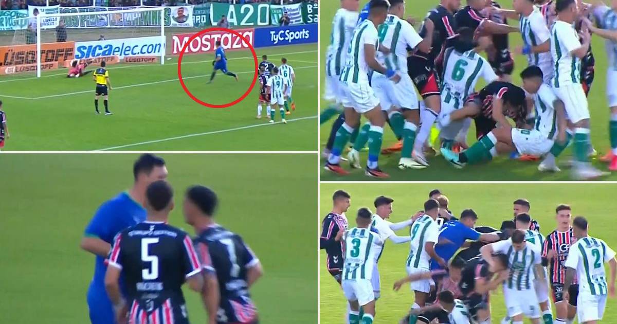 Luego de que la pelota pegara en el vertical, un defensor del cuadro visitante llegó a rechazarla al costado y mientras el guardameta volvía a su área fue increpado por sus rivales hasta que se armó la tángana.