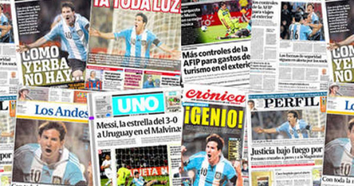 Lionel Messi acapara este sábado unánimes elogios de la prensa de su país tras la victoria de Argentina sobre Uruguay (3-0) que él se encargó de encauzar con dos goles y la primera puntada en la jugada previa de otro en el partido disputado en Mendoza.