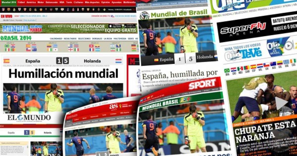 'La peor pesadilla del campeón' tituló diario AS agregando que 'Robben y Van Persie, con dos goles cada uno, destrozan al contragolpe a la Selección. Holanda remontó al descanso el gol de penalti dudoso a Diego Costa. En el tercer gol 'oranje' hay falta a Casillas. La defensa española fue un juguete roto'.