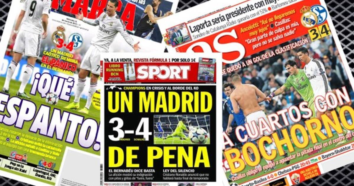 'Espanto', 'bochorno', 'ridículo' y 'de pena' son los términos con los que la prensa deportiva española ilustra el partido del Real Madrid frente al Schalke 04 anoche en el Santiago Bernabéu, donde los blancos perdieron 3-4 aunque se clasificaron para los cuartos de final de la Liga de Campeones.
