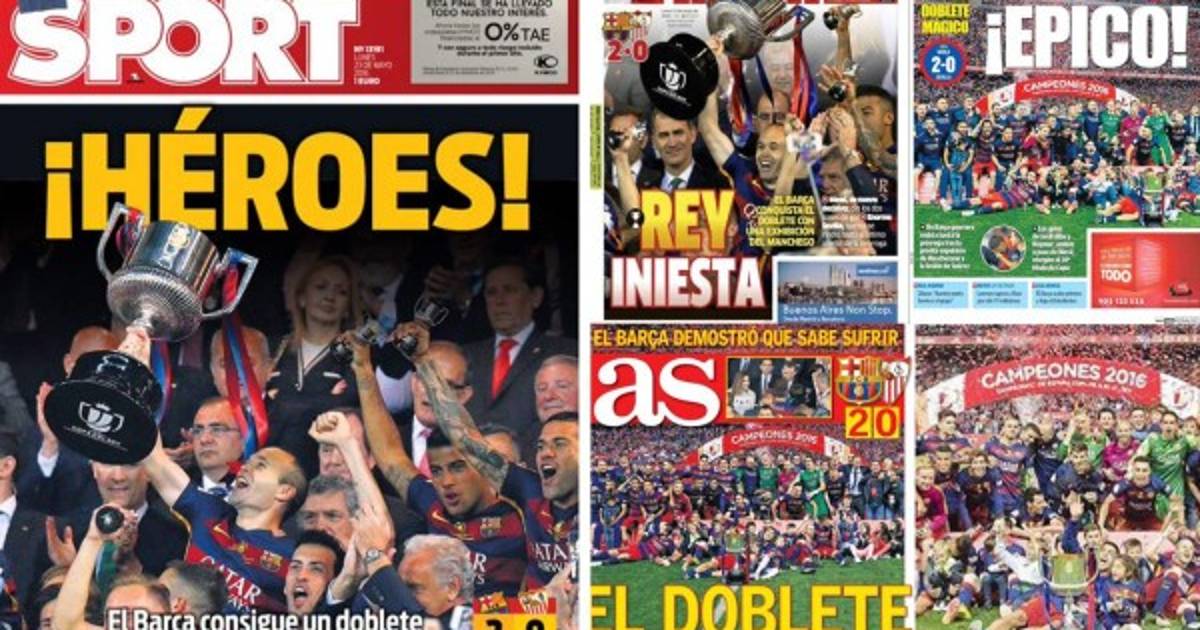 Por su parte, el diario madrileño destaca que el doblete quedó en manos del Barcelona, dejando al Sevilla solo con el título de Liga de Europa esta temporada.