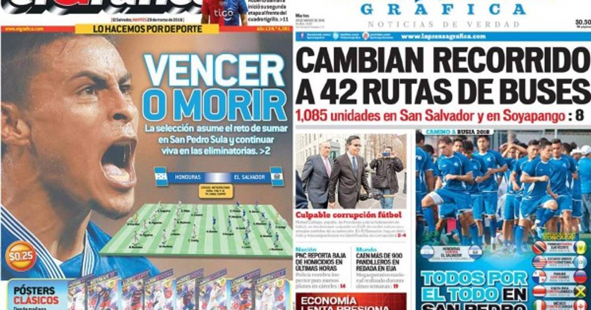 La prensa cuscatleca se toma el partido de la misma manera que sus jugadores. 'Vencer o morior', titular el diario El Gráfico y resaltan que su selección asume el reto de sumar puntos en San Pedro Sula para seguir vivos.