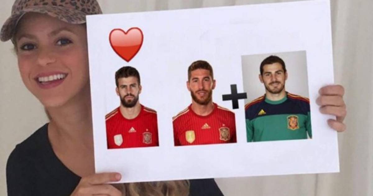En ella salen, todos vestidos con la camiseta de España, la foto de su marido Piqué (con un corazón encima), la de Ramos al lado con un signo de 'más' seguido de Casillas.
