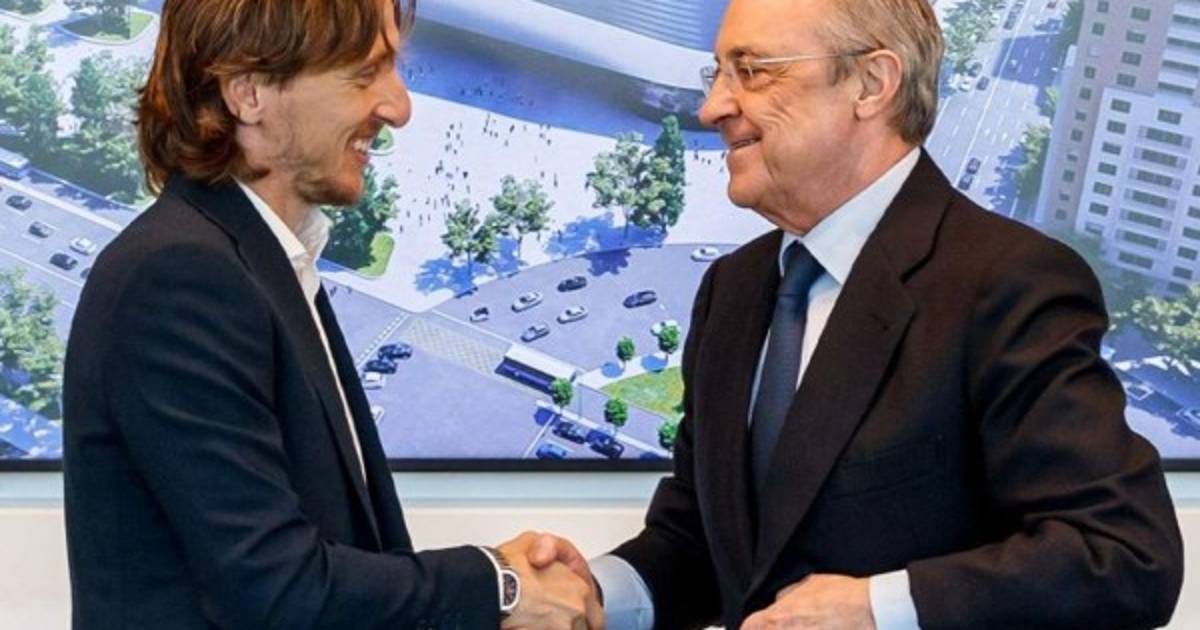 'El centrocampista croata queda vinculado a nuestro club hasta el 30 de junio de 2022', añadió el Real Madrid, que acompañó el comunicado con una foto del centrocampista recibiendo una camiseta de manos de Pérez con su nombre y el año 2022.