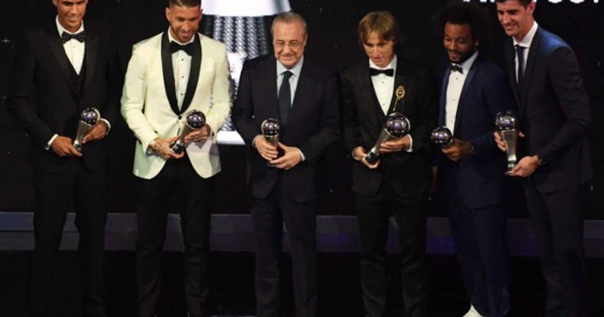 Modric posó como gran protagonista con sus dos premios, 'The best' y en el once de mejores jugadores del mundo, en el que también fueron elegidos Courtois, Ramos, Marcelo y Varane. Todos ellos con sus galardones posaron sonrientes junto a sus compañeros.