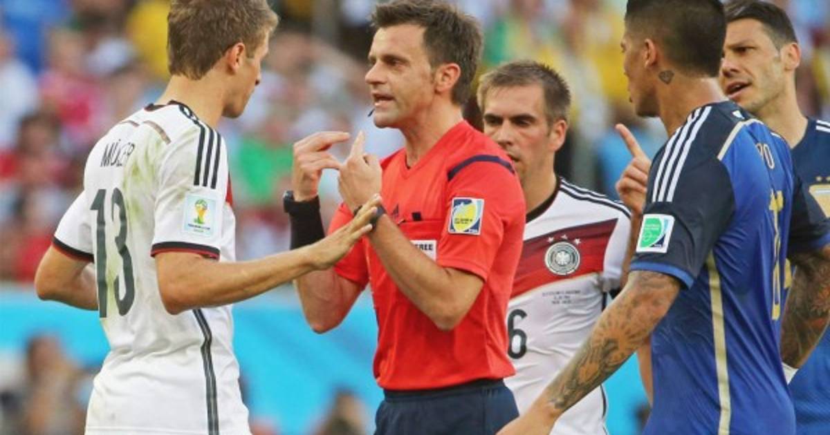 Fue sin dudas la jugada más polémica de la final de la justa mundialista entre Argentina y Alemania. Si el referí cobraba la falta, era penal para Argentina y tarjeta roja -por último recurso- por el número del equipo germano.