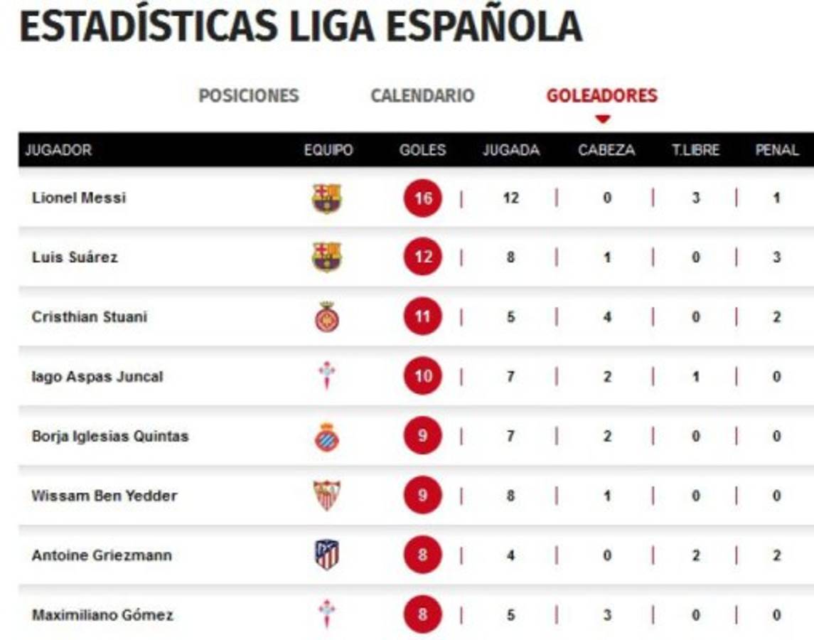 La tabla de goleadores en la Liga de España.