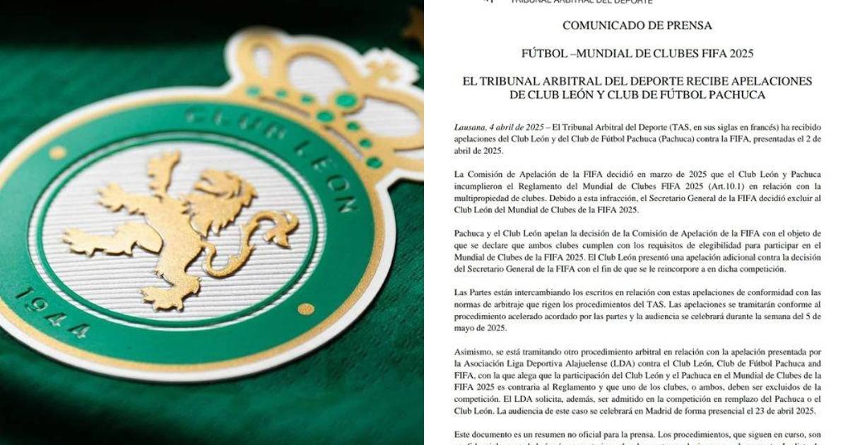 El TAS explicó también que el León presentó además una apelación adicional contra la decisión del secretario general de la FIFA para que se le readmita como participante en la primera edición del Mundial, que se jugará del 14 de junio al 13 de julio próximos en Estados Unidos.