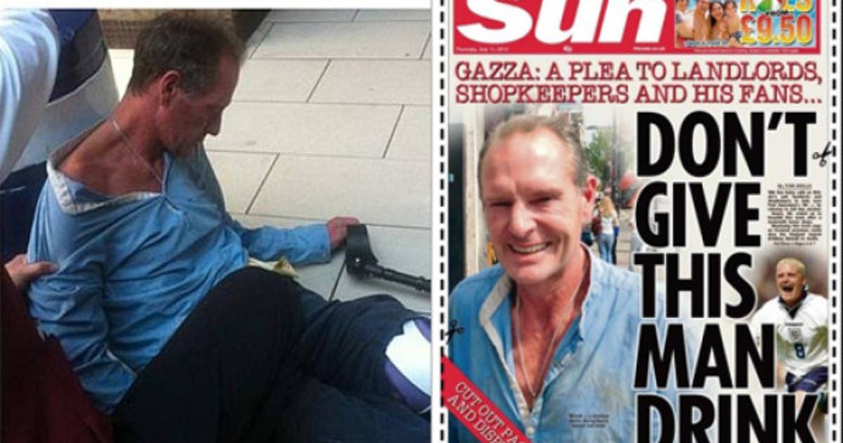 “‘The Sun’ les pide que ayuden a salvar la vida de Paul Gascoigne al no venderle alcohol, Mostrando esta portada en sus locales podría evitar que la leyenda de Inglaterra beba hasta morir”, se lee en el texto al lado de la página.
