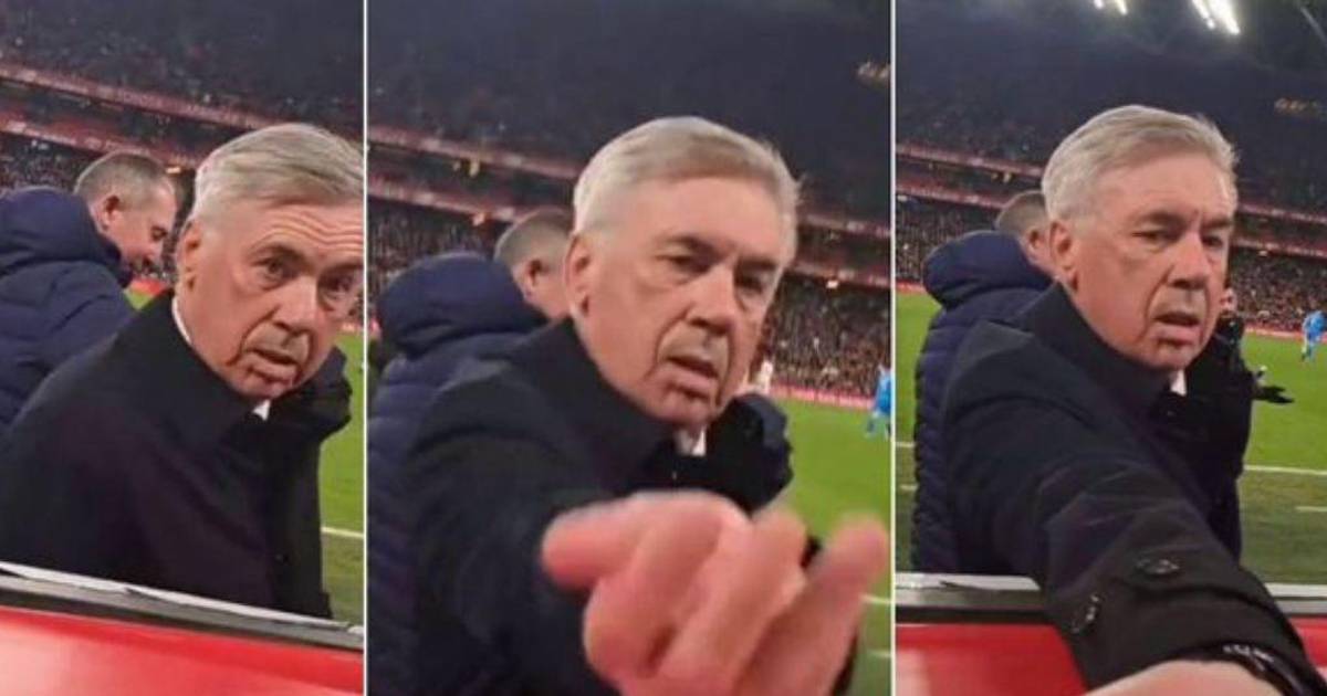 Durante se consumaba la victoria, Carlo Ancelotti, DT merengue vivió uno jocoso momento con un aficionado que estaba cerca del banquillo.
