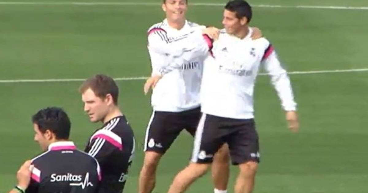 Cristiano fue a traer a James al otro rondo en que se encontraba y lo llevó al suyo que lo integran Marcelo, Módric, Gareth Bale y Raphael Varane.