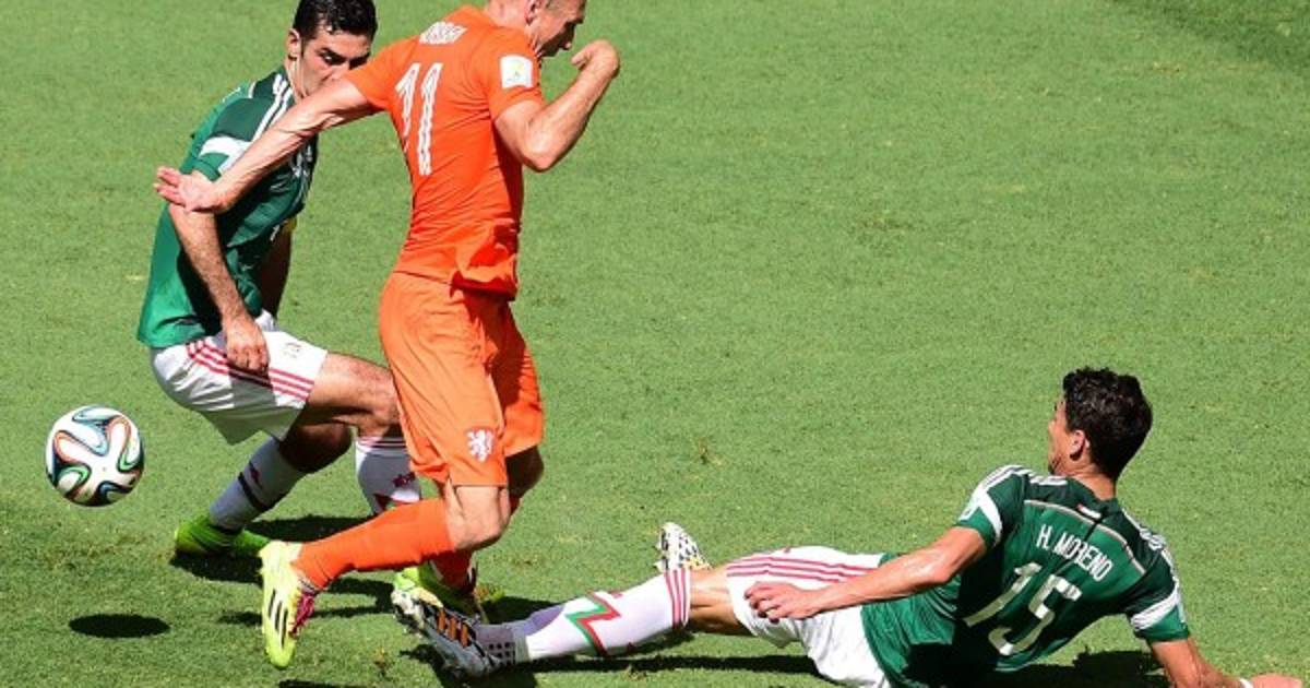 Robben aprovechó un error de Rafael Márquez, se metió al área y cuando se disponía a esquivar la marca Héctor Moreno le cometió una dura entrada, antes el capitán azteca lo había desestabilizado.