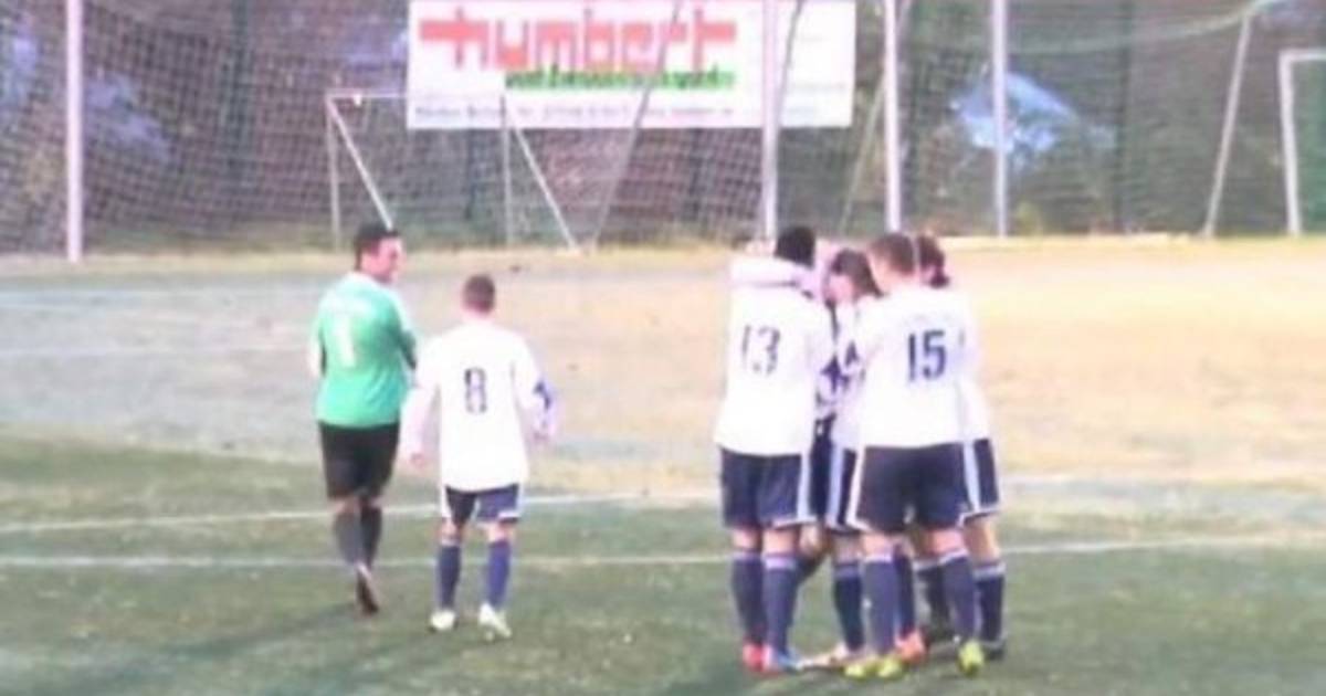 En la grabación puede verse a Maurice Kühn, mediocampista del TSV, patear desde media cancha y marcar un gol luego de que el balón chocara tres veces contra los palos y travesaños.