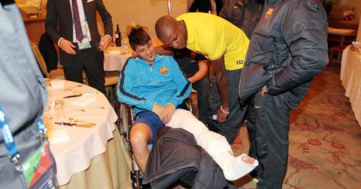 El 'Guaje', tal y como reflejan las fotos proporcionadas por el Barcelona, recibió el apoyo de compañeros, técnicos y directivos después de confirmarse que la fractura en la tibia izquierda que se produjo ante el Al Sadd le mantendrá entre cuatro y cinco meses alejado de los terrenos de juego.